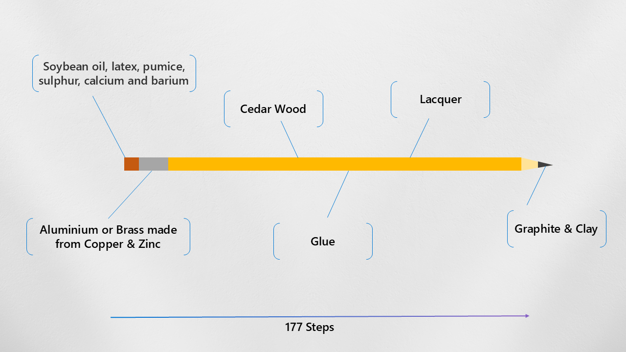 In fact in a manufacturing plant it takes over 177 steps to build the pencil!