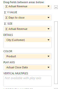 - Drag the following fields (actual Revenue, Days to Close, City, Product, Actual Close date ) below the existing chart (this will create a new table)