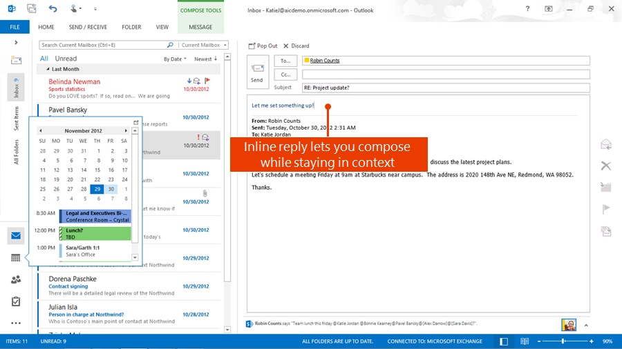 This week I had the chance to speak with Lillian Hiscox, Lillian is a solution specialist in the productivity (Outlook, Lync, Office, etc) team here at Microsoft. On my way home I stopped by her desk and we had a brief chat about some of the new features coming in Outlook 2013.