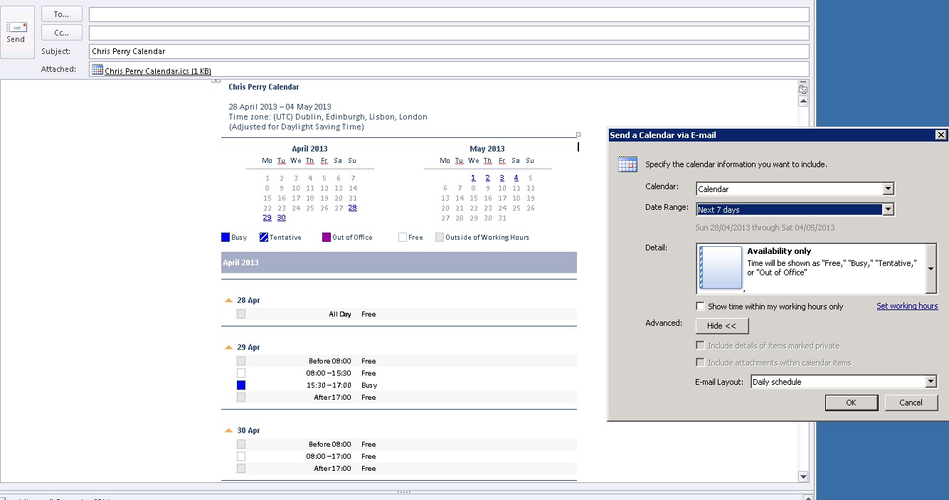 Arranging meetings can be a hassle, and it is unproductive, so to make it easy I insert my calendar directly on my email so people outside of my organisation can see when I am free (From the ribbon select insert calendar). I keep total control of my diary and I can also keep my meetings private.