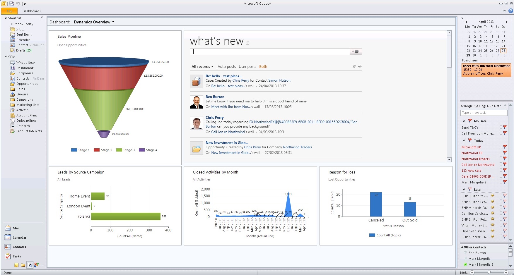 I love the way I can customise my own Outlook. I can choose my own shortcuts, I can remove my own navigation items, I can place my reading panes, I can have everything I need on one page without needing to navigate to different pages or applications. On top of all this, as a user I am no longer thinking in terms of systems, I have Email, Calendar, CRM, SharePoint Document Management and my social feeds all in once place. This is what my Outlook looks like: