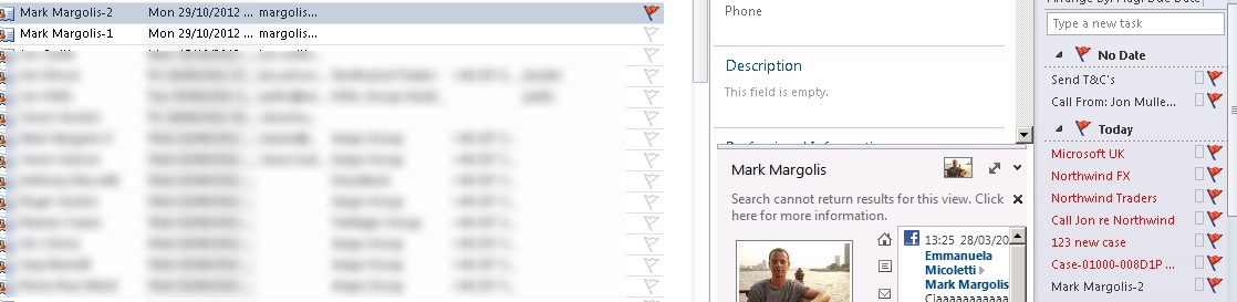 I don’t have the best memory in the world so I run my life with lists. And post it notes (or I used to). Now I simply pin items or tasks to my Outlook, they sit comfortably in my to-do panel in Outlook. These can be emails I need to send, tasks I need to do, Contacts I need to remember, Opportunities I need to work on (any CRM record really). In the example below you can see how I have pinned a record (see the red flag) so that it appears in my to do list on the right pane.