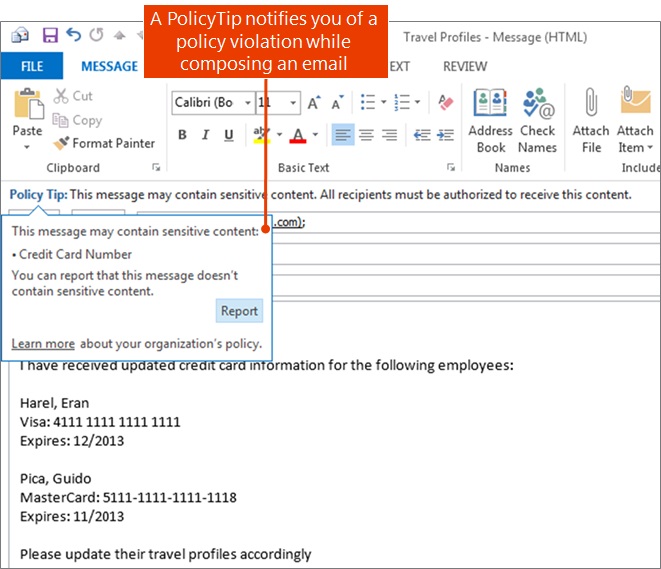 With Outlook 2013 you can be warned if you are about to send sensitive information in an email. Information such as credit card information can be detected within the email and outlook will want you about the potential policy violation.