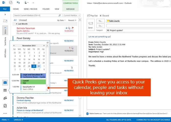This is a real time saver. Organising meetings is a real pet hate of mine, if you concur then you’ll like this. Quick Peaks allow you to hover over your calendar and within the same window you can see what appointments you have. You don’t have to switch windows you can be working right within your email.