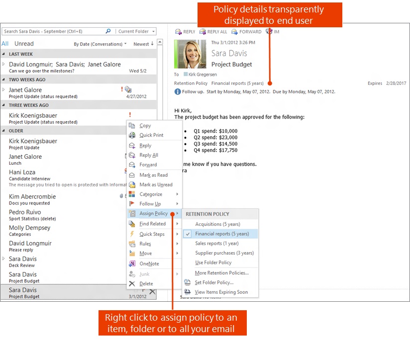 With Policy details I can easily select one of more emails and determine how long I want to keep emails. Organisations can define their own policies based on best practice and all I need to do is say how I want the email(s) to be treated. For example I can select and email and ask Outlook to automatically delete after it 30 days. That way I know that if I need it in the short term it will be there but it is not going to clog up my email system in the months to come.