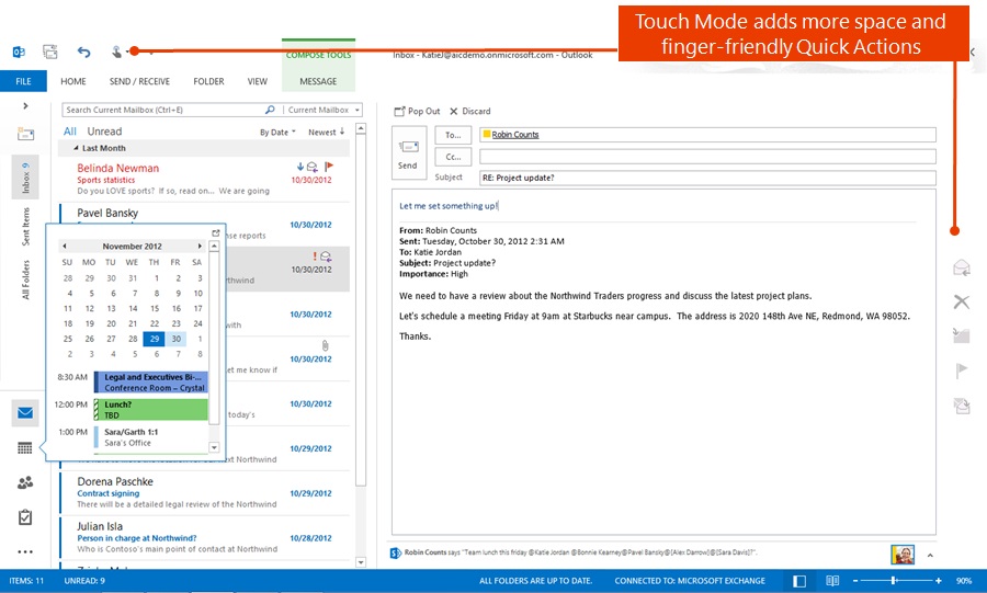 With Outlook 2013 I can switch between touch and non touch (normal mode). This means that when I am using my device as a tablet I get an experience more suited to gestures (such as bigger buttons) and when I return to docked or the keyboard I can go back to normal usage. I really like the fact that I can use the same software and tools and they can be tailored to the way I want to work.