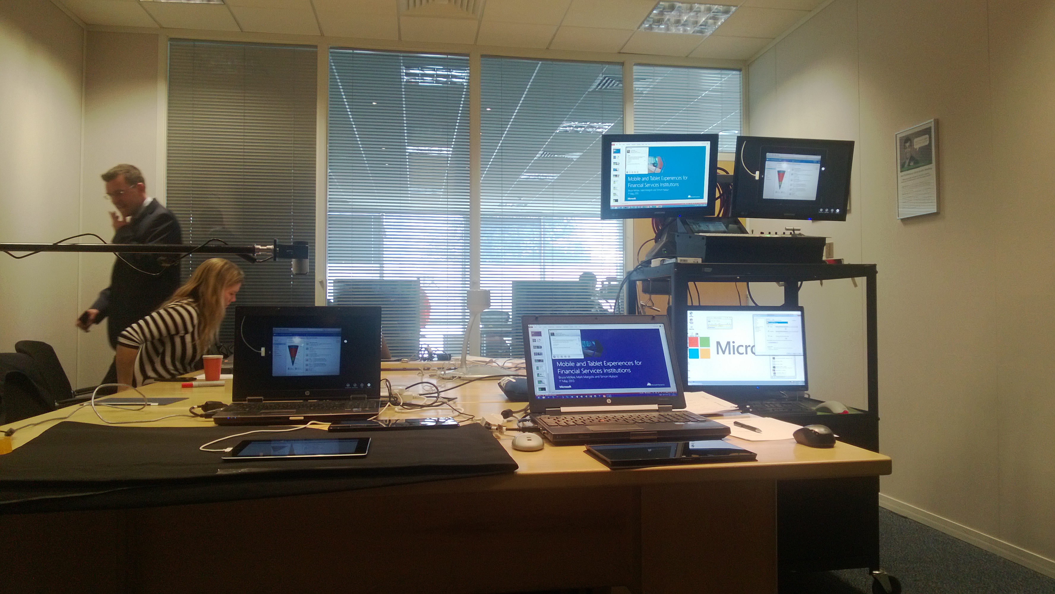 Last week my team and I put together a Webinar on the topic of Mobile CRM and Tablet Experiences for Financial Services Institutions. You can view a recording of the webinar online here. Below are the slides and notes that we presented at the event. At the end you can also see a backstage picture of the setup we had.
