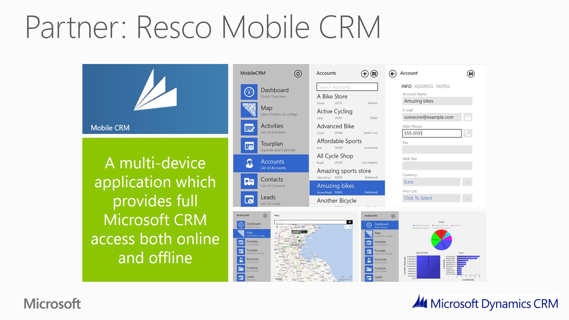 Resco Mobile CRM provides comprehensive CRM functionality is available today (free and paid version) on multiple devices (iPhone, iPad, Windows 8, Windows Phone, Android, etc)