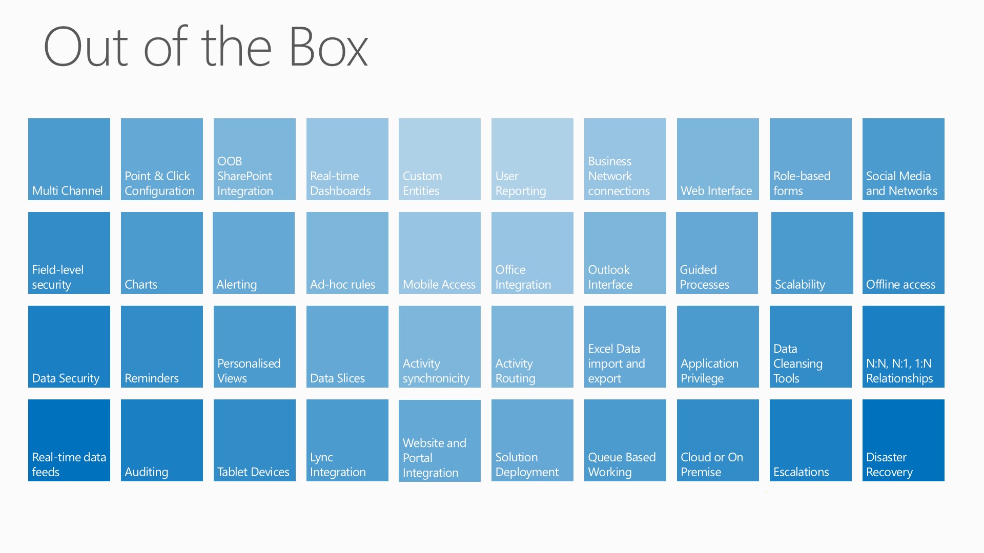 - Native Features – Microsoft provides many benefits beyond traditional CRM features (Sales, Marketing, Support) Platform capabilities such as Mobility, Social, Business Process Mgmt, Business Intelligence, Outlook/Office/Lync, Configuration, Extensibility, Role based Security, Auditing, Deployment, Scalability, Manageability, Data Cleansing, Upgrade means that you team can focus on the features that deliver the most value to your business.