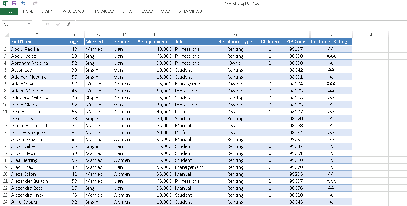 Here is a look at the CRM data. Notice that we have a number of important data fields for our analysis: Gender, Age, Yearly Income, Marital Status, Job, Residence Type, Number of Children,  Address (ZIP Code) and Customer Rating (A, AA, AAA). We will try to uncover the hidden correlations between these fields to get a good predictor of the customer rating. Notice that we also have a linked table with the customer’s financial accounts.