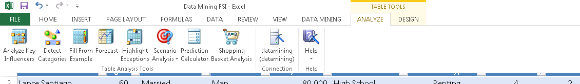 Once we’ve connect Excel to our SQL Database in the Azure Virtual Machine, we get access to the SQL Data Mining Algorithms right from the Excel Ribbon.