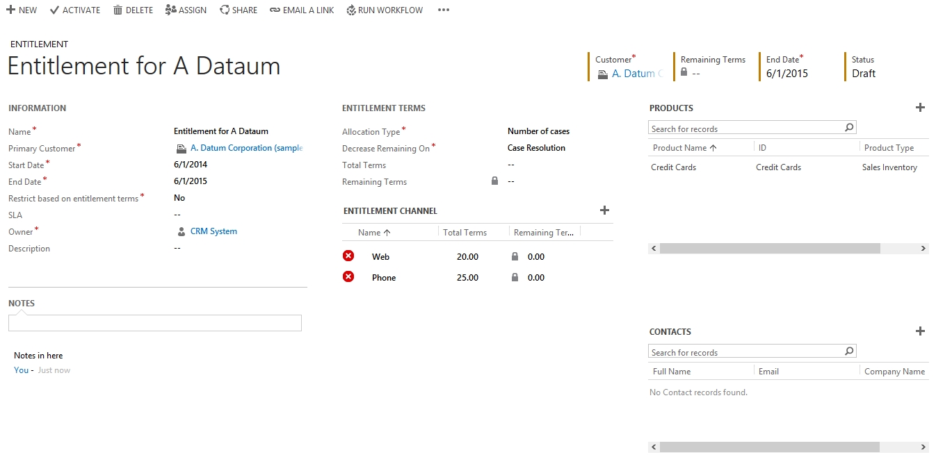 As you can see above you can specify and restrict a service based on Primary customer, SLA, Terms, Type, Channels, Products and Contacts. You can create entitlement based on a template.