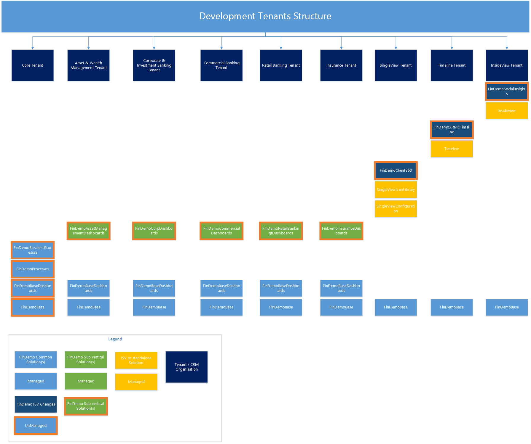 For ease of development and deployment the FinDemo development environment has been split into multiple solutions & tenants. The details of each solution is outlined in the following section and includes the rationale for the split.